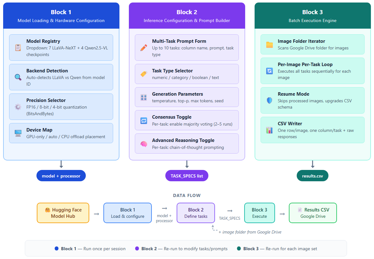 Step 3: Run analysis. Point to a Google Drive image folder. The engine processes all images sequentially, writing results to CSV as it goes. Supports resume mode, schema upgrading (add tasks between runs), checkpoint saves every 5 images, and built-in truncation detection.