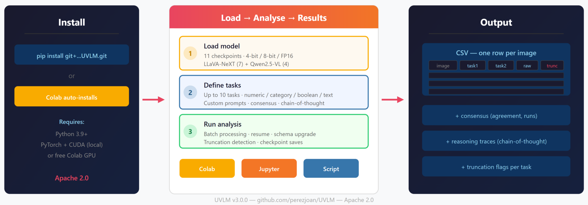 Since v3.0.0 (April 2026), UVLM is a pip-installable package that runs anywhere Python runs — Google Colab, local Jupyter notebooks, or plain scripts. No GPU ownership required for Colab; for local use, any NVIDIA GPU with 8+ GB VRAM handles models up to 7B parameters in 4-bit quantisation.