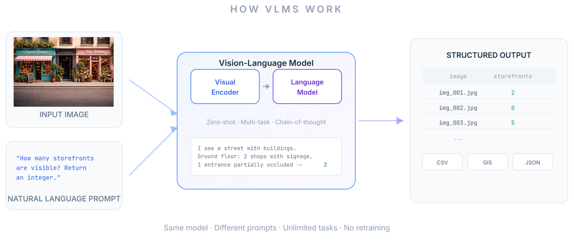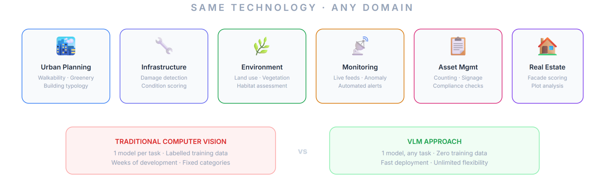 This flexibility makes VLMs a powerful tool for applied image analysis. A single model can perform dozens of different analysis tasks on the same image simply by changing the text prompt, with no retraining, no labelling, and no task-specific model development. For organisations that need to extract structured data from large image datasets — urban surveys, site inspections, environmental assessments, fleet monitoring — VLMs offer a step change in efficiency and scalability.