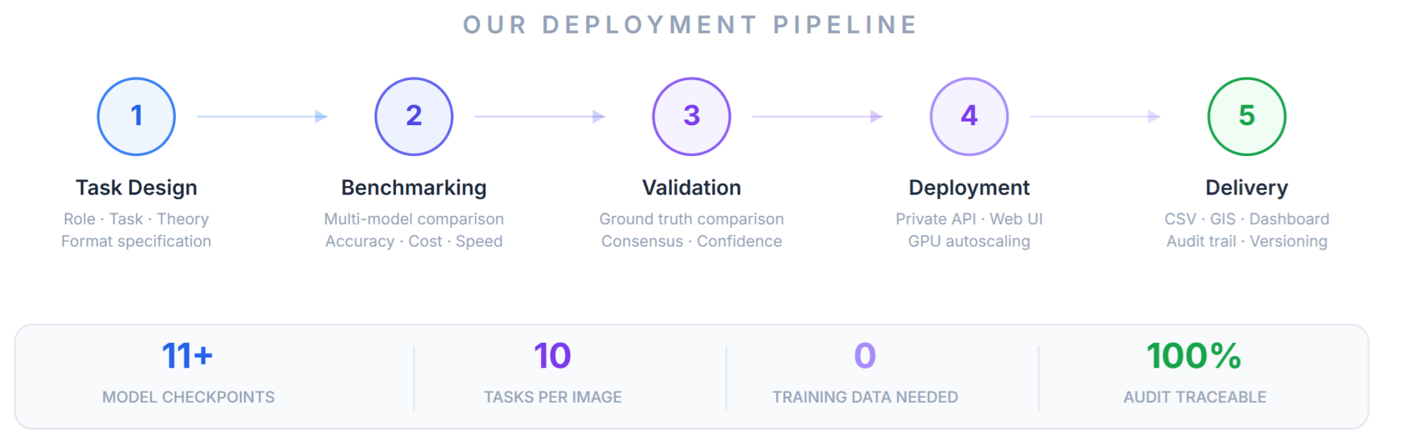 For clients who need VLM analysis at scale, UGA deploys production-grade infrastructure. This includes private API deployment on cloud or on-premise GPU servers where data never leaves the client’s security perimeter; custom web frontends with image upload, task configuration, batch monitoring, and result exploration with role-based access control; GPU autoscaling for high-throughput batch processing with checkpointing and error recovery; and structured output integrated directly with GIS platforms, databases, and downstream analytics pipelines.